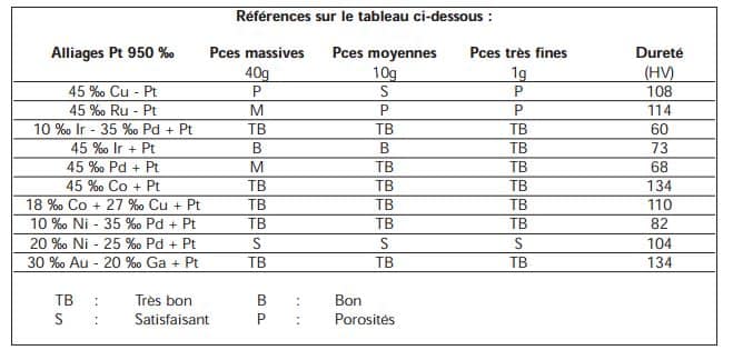 L’accord de référence, notamment testé chez FCP, se compose de platine, cuivre et 18 ‰ de cobalt. Le cobalt, mais aussi le fer ou le nickel, confèrent des propriétés magnétiques passés certains seuils. Cet alliage a l’avantage d’offrir une blancheur accrue et moins de casse lors de la fonte à la cire. Dans le même esprit, certains mélanges reçoivent du palladium, du cobalt, de l’indium ou du gallium pour doper les capacités mécaniques ou pousser la température de travail vers le haut. D’autres comme les mélanges platine-or-gallium étendent le champ de travail entre 90 et 150°C. Globalement, oxydation et trempe perturbent peu ces alliages ; certains peuvent être trempés à l’eau à 850°C pendant une demi-heure.